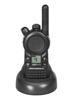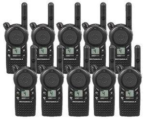 Ten-pack of Motorola CLS1410 radios. Each radio comes complete with a single-unit charger, 18 hour lithium ion battery pack, swivel belt holster and 1-year warranty.