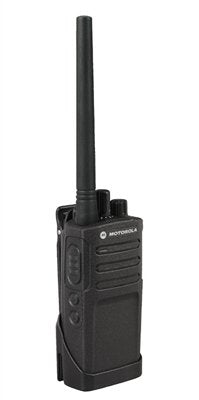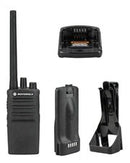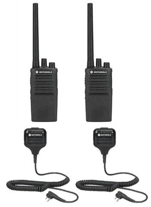 Two-pack of Motorola RMV2080 radios with speaker mics. Each radio comes complete with a single-unit charger, 15 hour lithium ion battery pack, swivel belt holster and 1-year warranty.