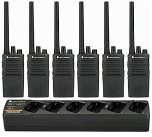 Six-pack of Motorola RMV2080 radios with Multi-Unit Charger. Each of radio comes complete with a 15 hour lithium ion battery pack and swivel belt holster.