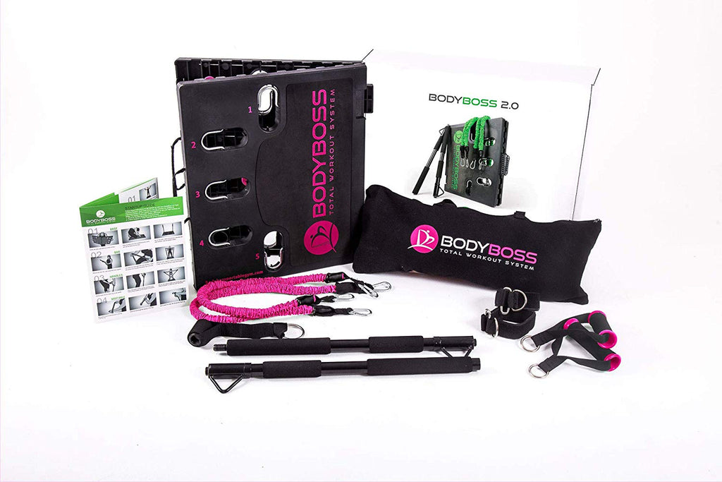 BodyBoss Home Gym 2.0 - Full Portable Gym Home Workout Package + 1 Set of Resistance Bands - Collapsible Resistance Bar, Handles - Full Body Workouts for Home, Travel or Outside (Pink)